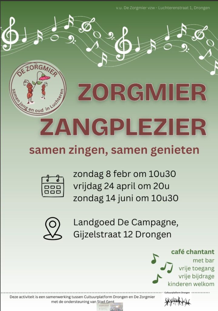 Iedereen is van harte welkom op dit café chantant, waar jong en oud samen bekende liedjes van vroeger en nu zingen. Een gezellige sfeer is verzekerd! En dat alles op de prachtige locatie van Landgoed De Campagne in Drongen. Inschrijven is niet nodig en je hoeft niet eens te kunnen zingen. Iedereen kan meedoen!
