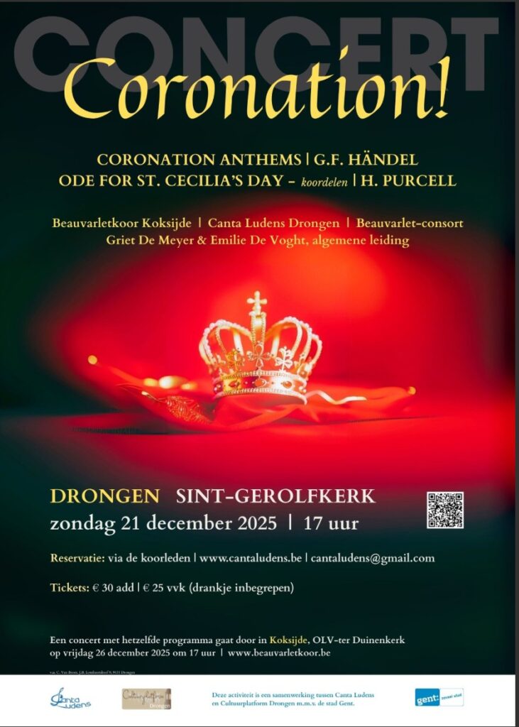 Het koor Canta Ludens Drongen, het Beauvarletkoor Koksijde en het orkest Beauvarlet consort presenteren onder leiding van Emilie De Voght en Griet De Meyer een avond vol barokke grootsheid met de magistrale Coronation Anthems van Georg Friedrich Händel – waaronder het wereldberoemde Zadok the Priest, dat al eeuwenlang klinkt bij koninklijke kroningen – en Henry Purcell’s Ode for St. Cecilia’s Day, een meesterwerk vol jubelende koren, lyrische aria’s en rijke orkestratie. In deze feestelijke ode bezingt Purcell de kracht van muziek – een hemels eerbetoon aan de kunst die ons hart raakt en onze ziel verheft. Laat u tevens meevoeren naar de pracht en praal van de Britse kroningsceremonieën met een indrukwekkend concert vol koninklijke allure!